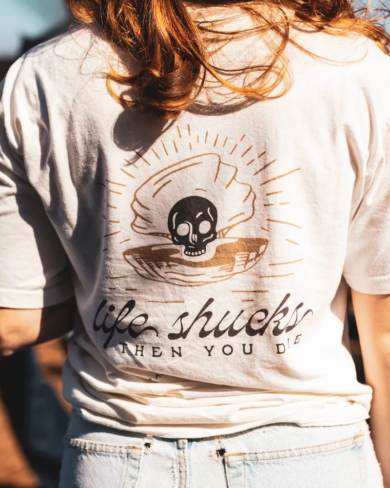 An easy, breezy t-shirt with a little bit of dark humor - what else do you need? Stay cool in our breathable Life Shucks tee. Also available in black.
